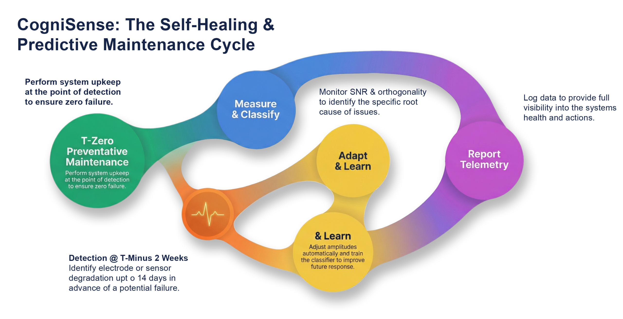 Our system runs a continuous self-diagnostic loop that monitors signal integrity and sensor health in real time. It begins by measuring SNR, orthogonality, and other performance indicators, then classifies deviations to identify the precise root cause of degradation. Based on that classification, the system adapts its operating parameters—automatically adjusting amplitudes and signal paths to maintain optimal performance. Each cycle reinforces the onboard model, enabling continuous learning and improved classifier accuracy. Telemetry is reported upstream for fleet‑level visibility, closing the loop and restarting the measurement phase.