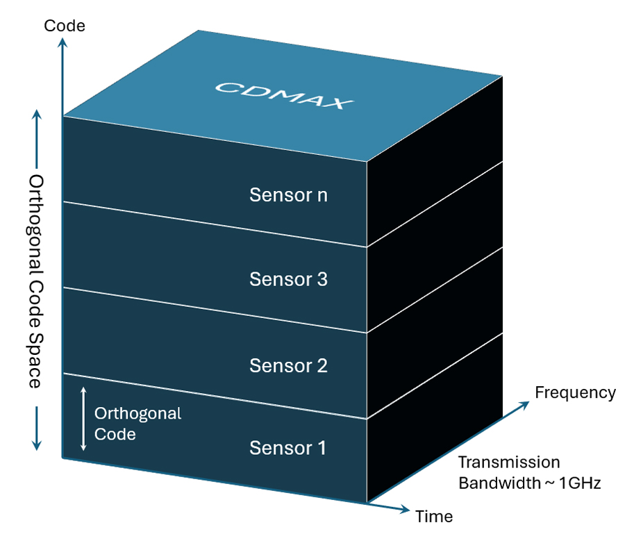CDMAX gives each sensor channel a unique orthogonal code, so the system separates signals mathematically rather than by time slots or frequency slices.